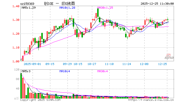 12月25日,截止午间收盘,创业板50ETF易方达(159369)跌0.38%,报1.297元,成交额143.79万元。创业板50ETF易方达(159369)重仓股方面,宁德时代截止午盘跌1.36%,东方财富涨0.13%,中际旭创跌1.20%,新易盛跌1.63%,胜宏科技跌2.16%,汇川技术涨1.42%,阳光电源涨0.29%,迈瑞医疗涨1.35%,同花顺涨0.68%,亿纬锂能跌1.34%。